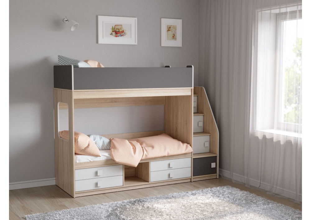 Классическая детская двухъярусная кровать с двумя параллельными спальными местами размером 1750х750 и 1900х750, выдвижными ящиками для хранения и угловой лестницей-стеллажем.